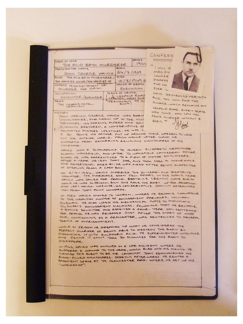 A small set model and a life-size mock-up of the drain down which the Acid Bath Murderer poured his victims, and a photo of my research folder in the style of a police report, for a CCW Foundation project based around murderers, entitled ‘Killer Instinct’.