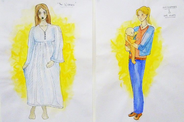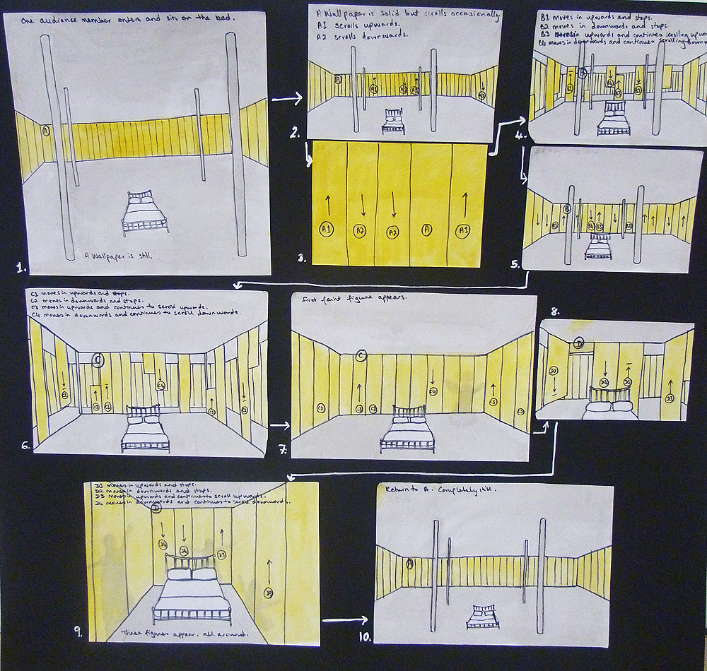 Publication material, costume designs, and storyboard for a 2nd Year speculative site-specific design of ‘The Yellow Wallpaper’, set at the Wapping Project, London. Scrolling wallpaper gradually encloses the audience member sitting on the bed, and ghostly women appear to be dancing behind it, before suddenly returning to normal. The audience emerges to find the cafe space filled with mums and babies.