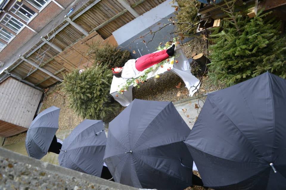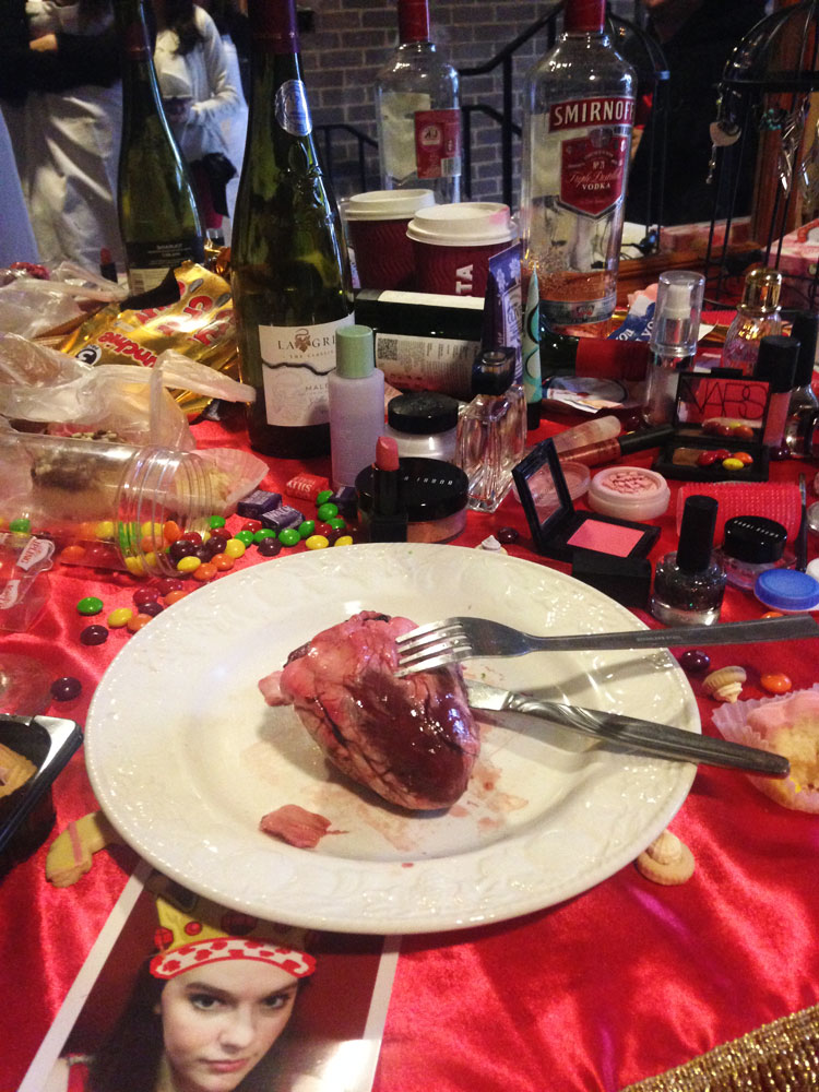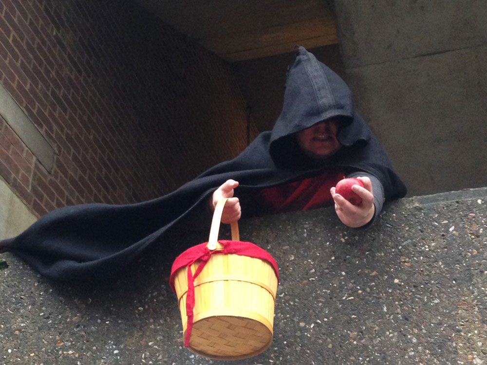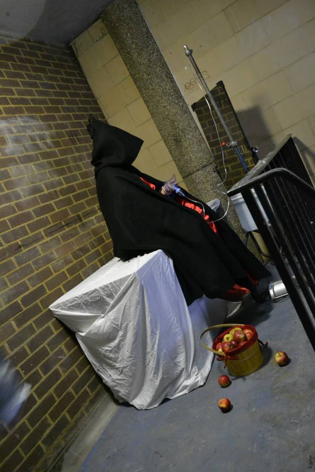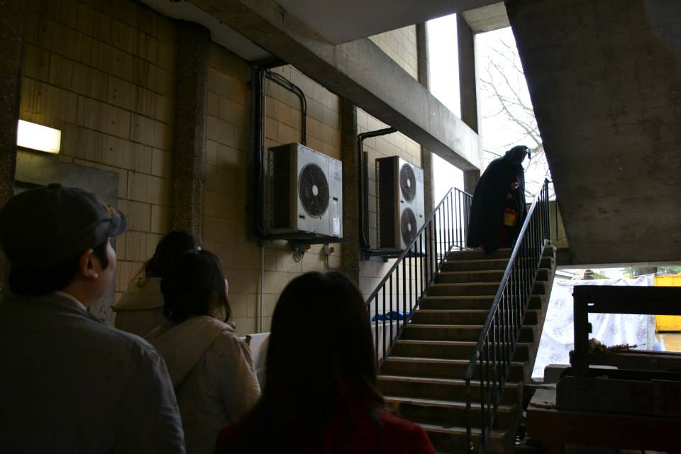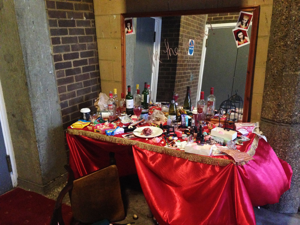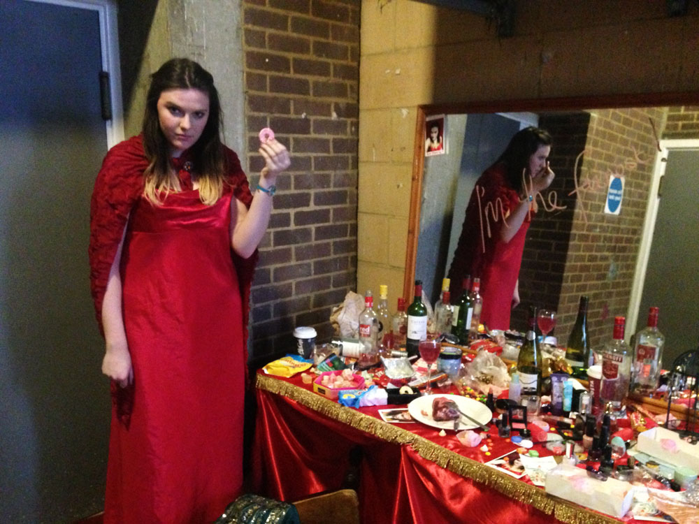 Production photos of a 2nd Year realised site-specific group project based on ‘Snow White’. The audience are led by the Hag up the stairs, discovering aspects of the story like the dead Snow White surrounded by mourning Dwarves, and the Queen’s completely destructive personality. I also played the Queen.