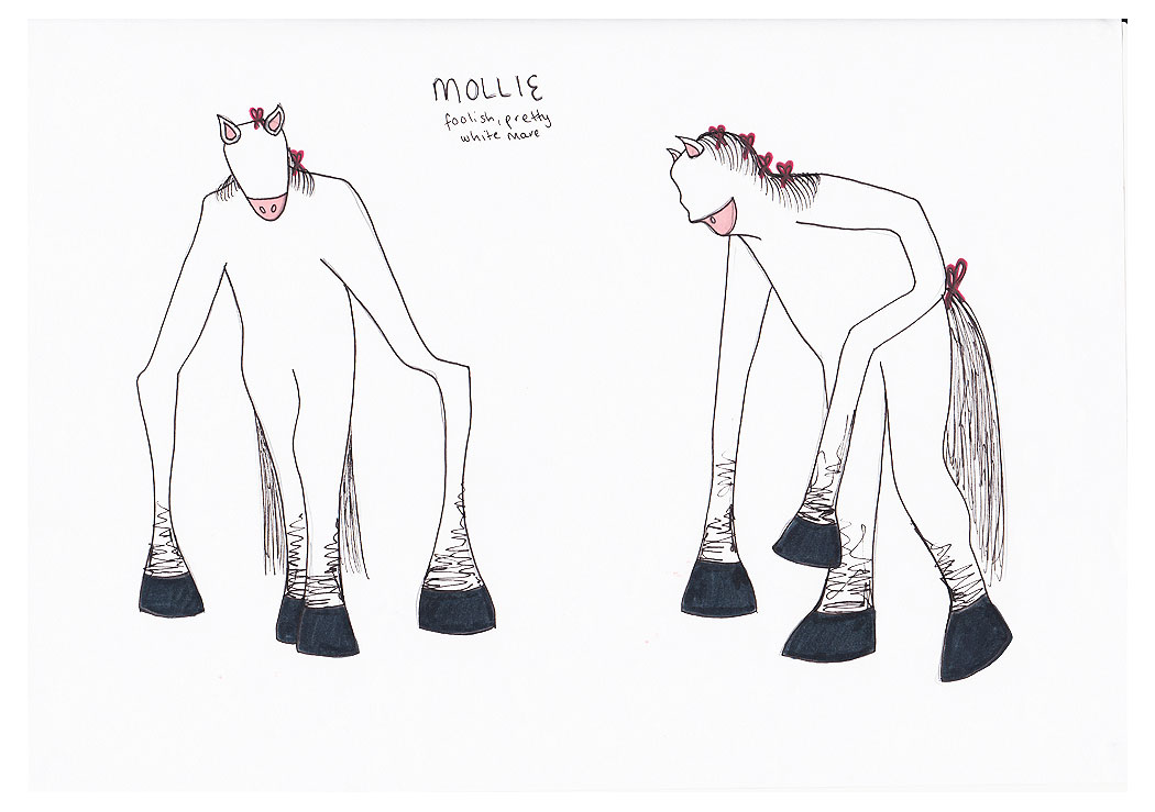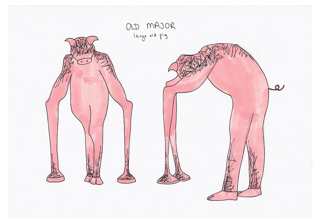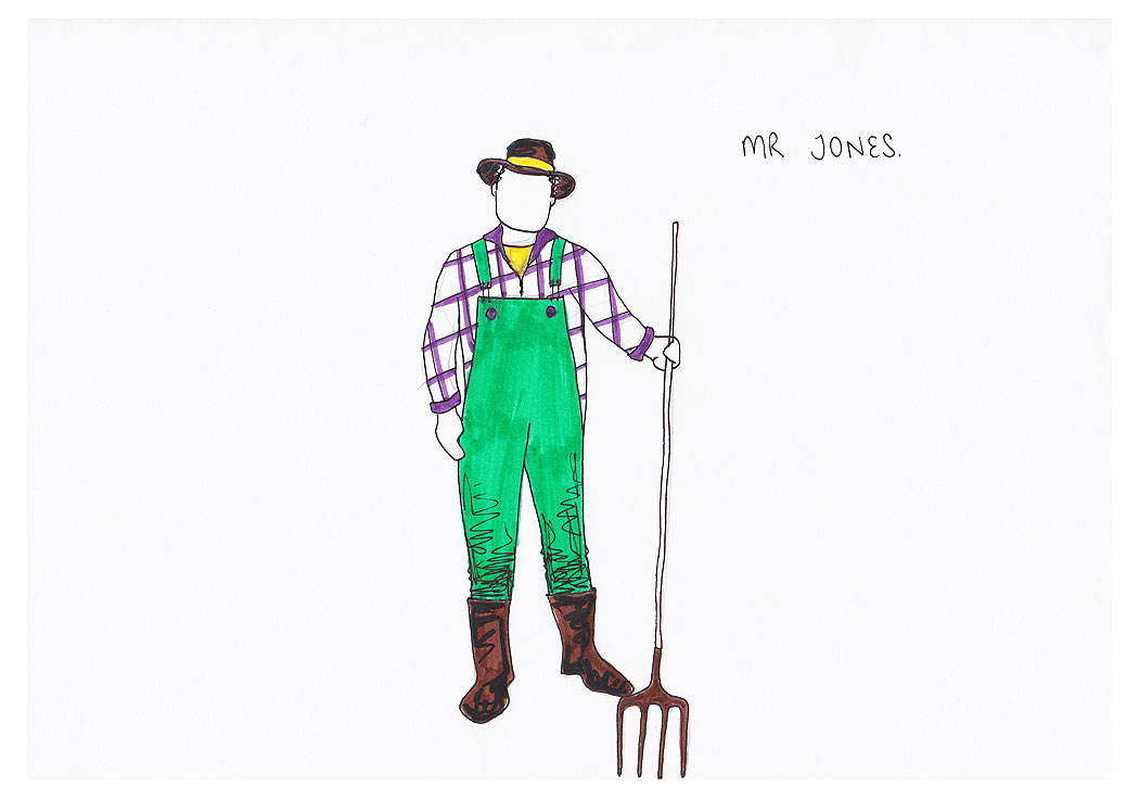 A selection of costume designs for a 1st Year design project of ‘Animal Farm’, and the real children’s drawings that inspired them.