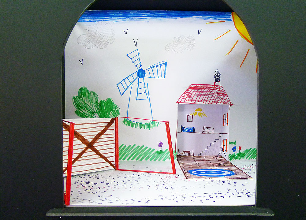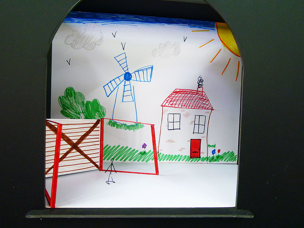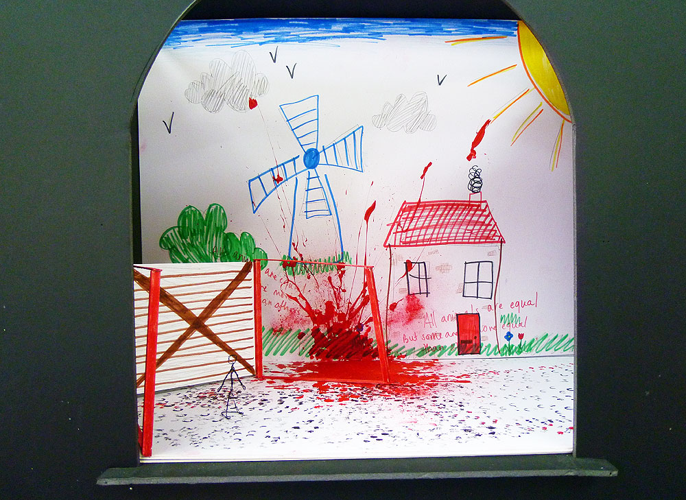 Set design for a speculative 1st Year design project of ‘Animal Farm’ set at the Lyric Hammersmith, alongside one of the children’s drawings that inspired it. The images below show the progression of the stage throughout the course of the show – it would start looking just like a children’s drawing, with some pop-up and fold-down elements. The floor would gradually become more and more chaotic with black ink stamped from the characters’ feet, until near the final showdown when the prints of the pigs would turn red. During the final fight paint would be thrown, and splatter all over the drawing.