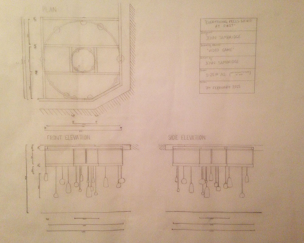 An example of a technical drawing for a set piece – this is from my 3rd Year realised collaborative project design for ‘Everything Feels Weird at First’.