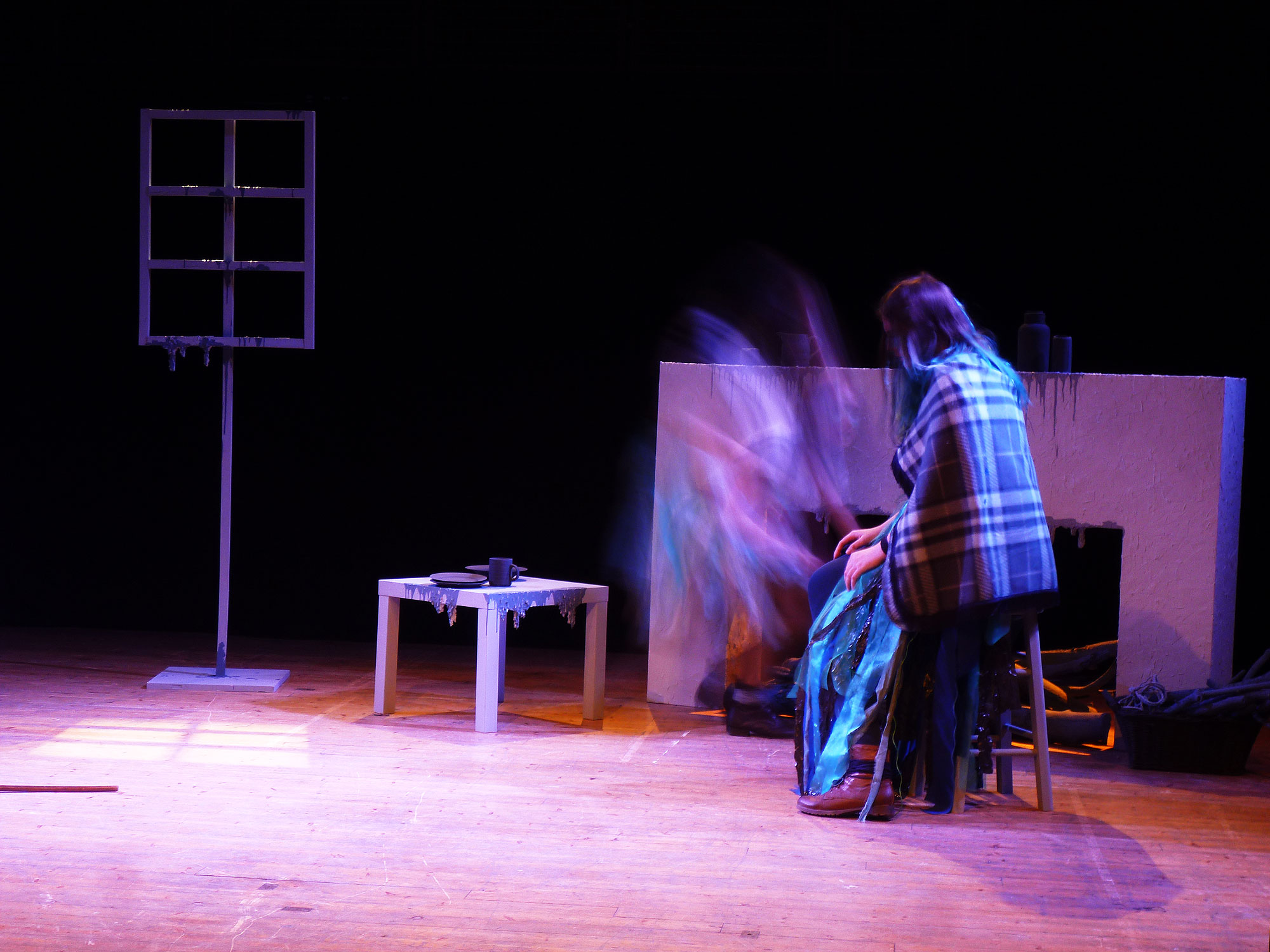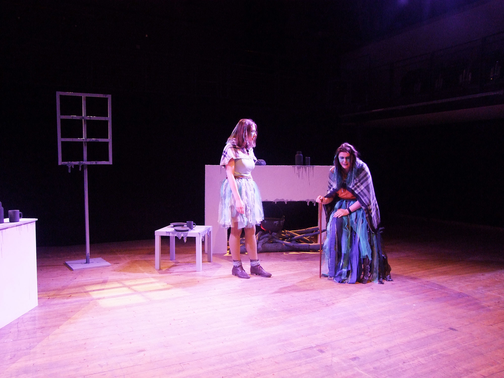 The design is as if the characters are in their little cottage but they are floating in a space, detached from the world. The objects are in a set of monochrome tones, like an old photograph, allowing the brighter, flowing characters to emerge. There are drips and stalactite-like structures everywhere, as if water is permeating everywhere and everything all the time. The characters themselves have flowing skirts that ripple and waft as they move, representing the waves of the sea. Both the characters and the music represent the sea – everything is affected by it and is consumed by it.
